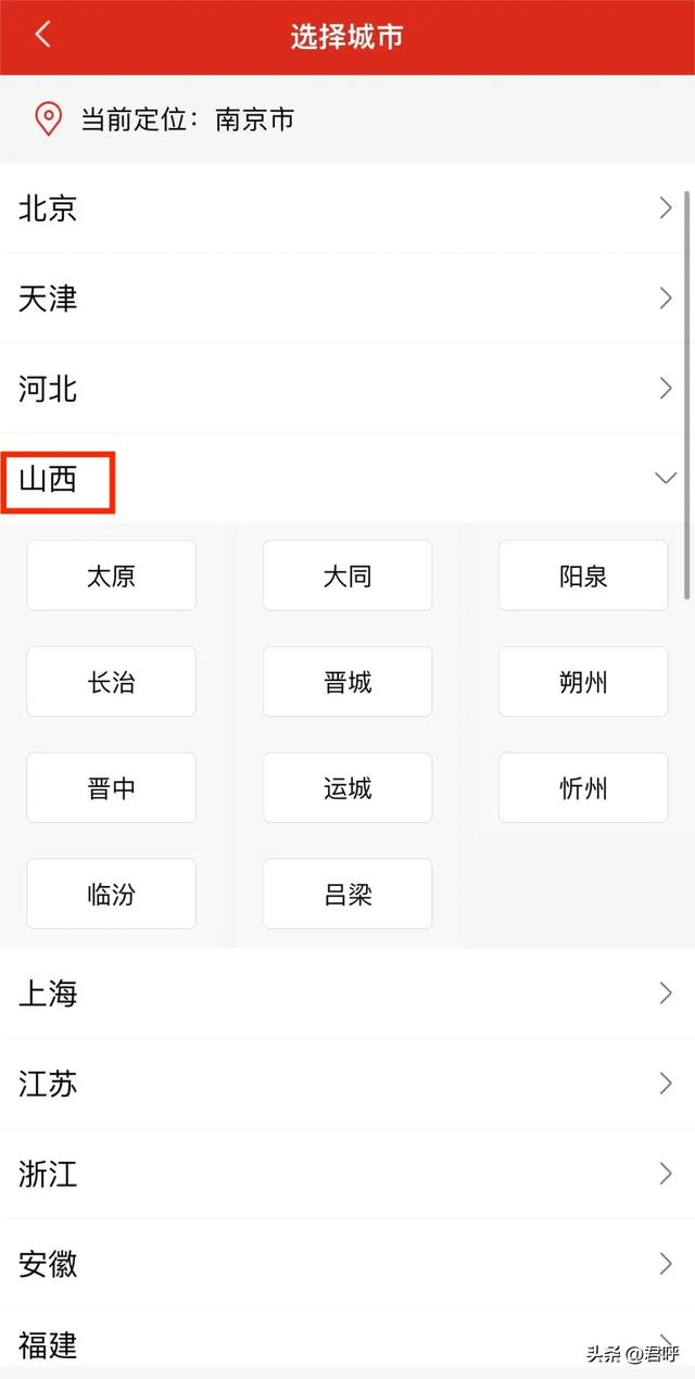 第二步:更改定位到“山西省”的城市;