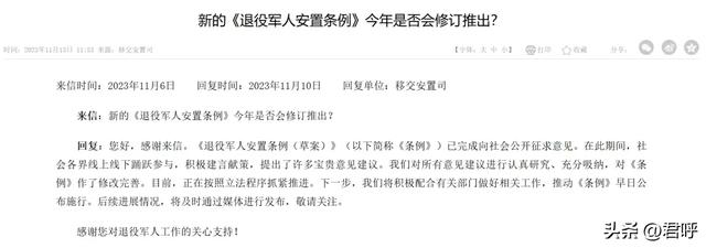 去年11月6日,就有网友在退役军人事务部官网“部长信箱”里留言,问到“新的《退役军人安置条例》今年是否会修订推出?”