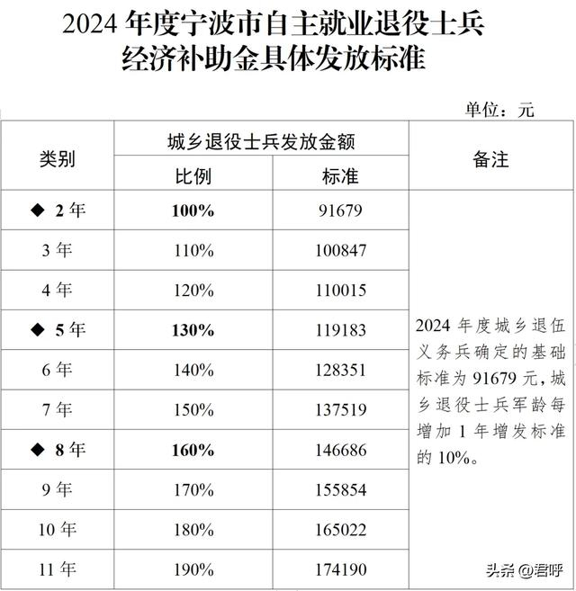浙江省宁波市2024年度服役满2年的自主就业退役士兵一次性经济补助标准为91679元,军龄每增加1年增发标准的10%。