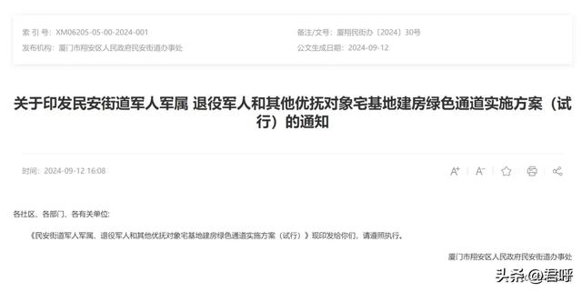 2024年9月12日,福建省厦门市翔安区人民政府正式发布了《关于印发民安街道军人军属、退役军人和其他优抚对象宅基地建房绿色通道实施方案(试行)的通知》,旨在进一步保障军人军属、退役军人和其他优抚对象的合法权益,为他们提供更加便捷、高效的宅基地建房服务。