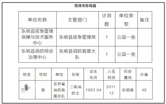 注意到,山东省菏泽市东明县,1人转岗安置提供了2个事业单位,其中有应急管理局保障与技术服务中心、消防综合治理中心;