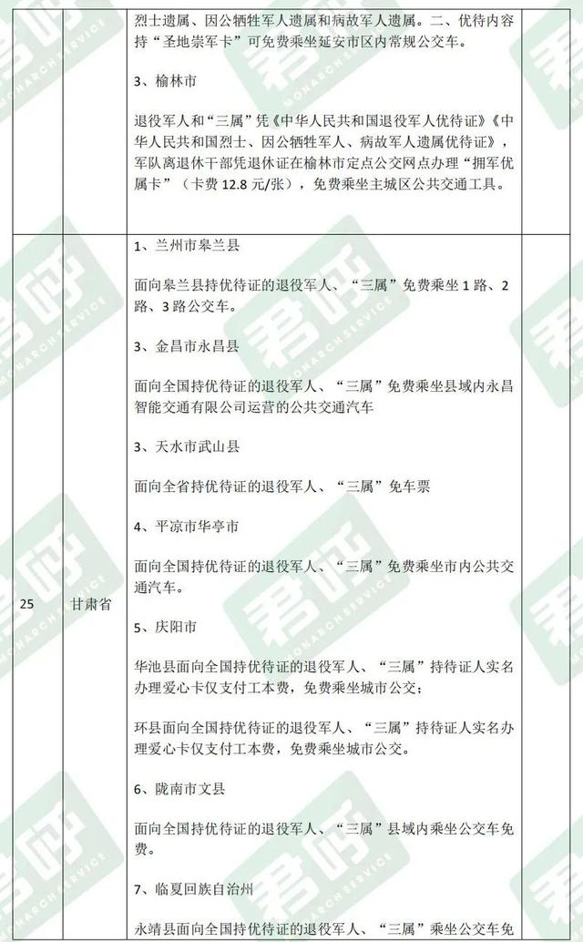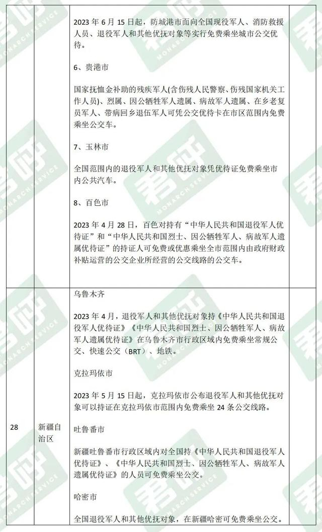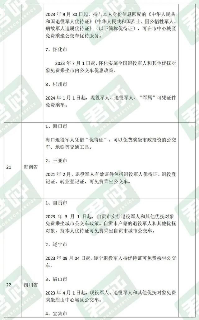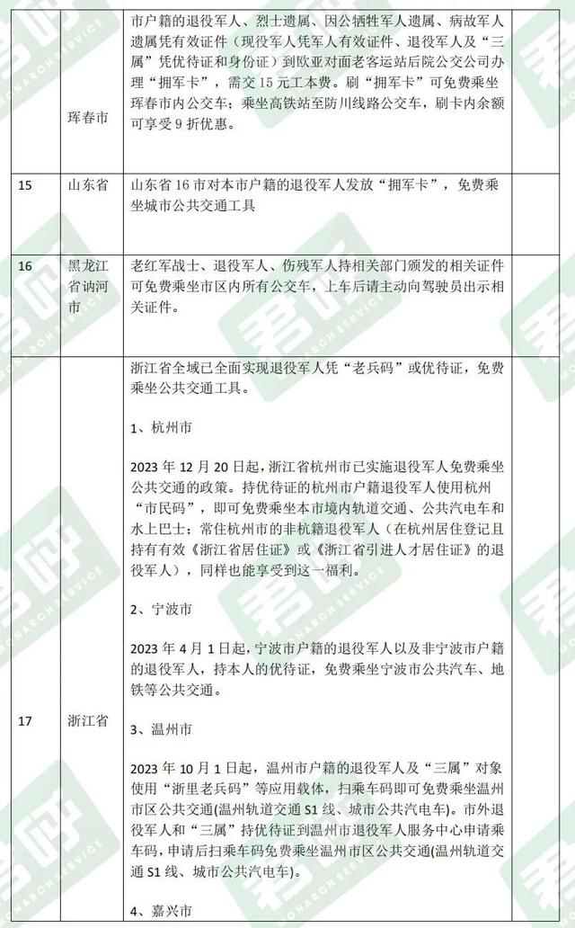 以下是全国部分城市持优待证可免费乘车的目录清单: