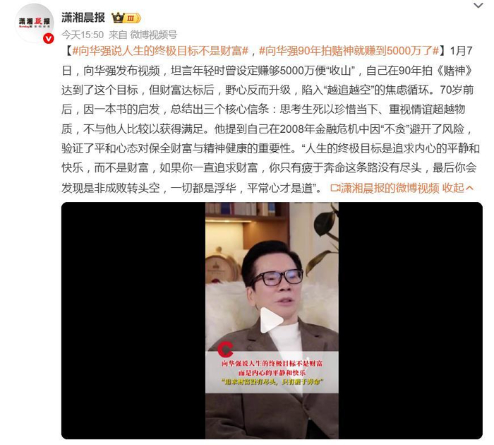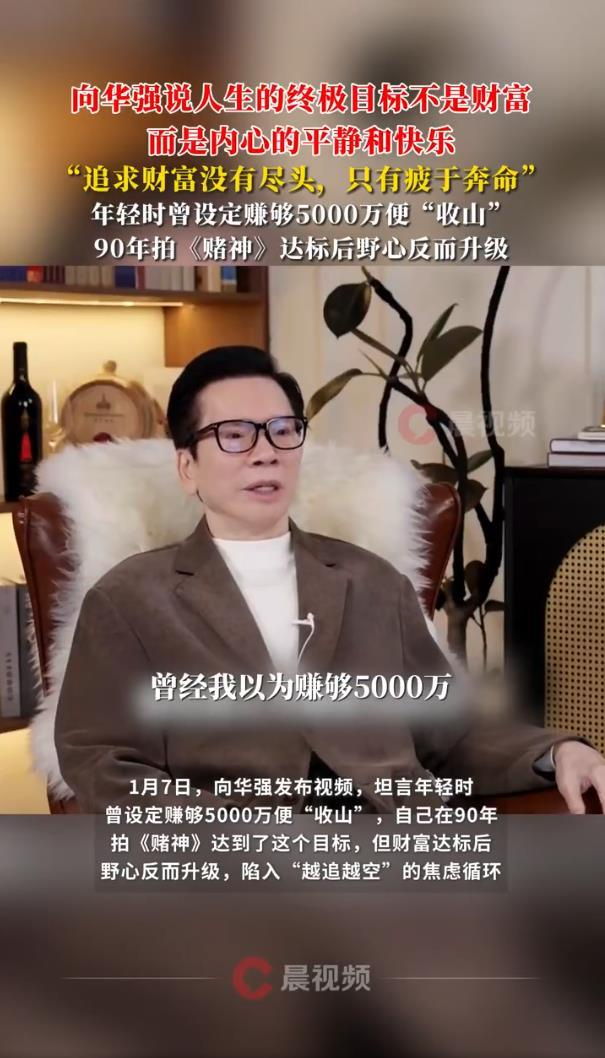据1月7日报道,近日,影视大亨向华强的一段采访视频,意外戳中了许多人的“财富焦虑”。他坦言,人生的终极目标并非财富积累,而是内心的平静与快乐。这番“大佬的清醒”,在追逐名利成风的当下,显得格外引人深思。