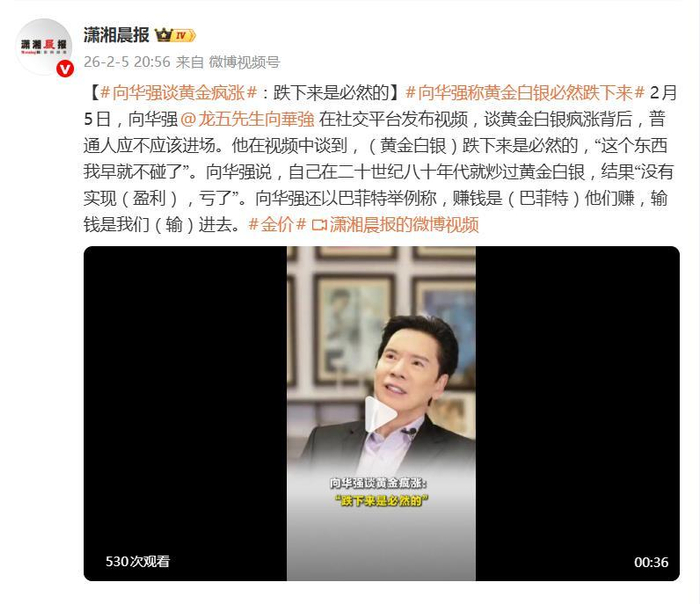 这可不是空口说白话,而是他用真金白银买来的教训。在2月5日发布的视频里,向华强自曝老底,坦言早在二十世纪八十年代,自己就下场炒过黄金白银,结果呢?不仅没赚到,反而实实在在地亏了钱。这番“过来人”的失败经历,瞬间让那些只看贼吃肉、没见贼挨打的跟风者清醒了几分。