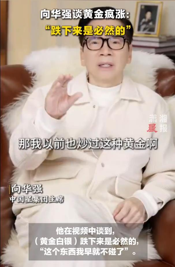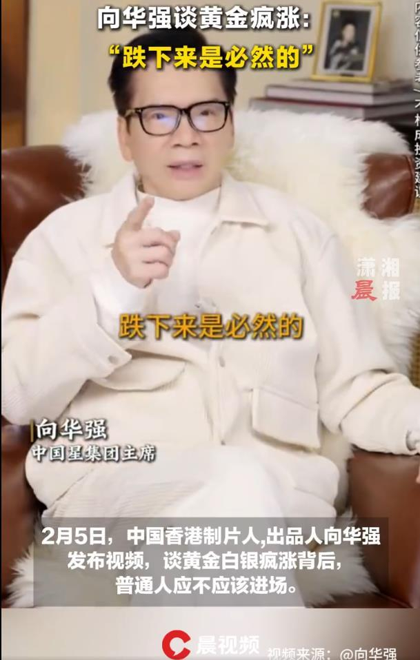 据2月5日报道,最近,影视大佬向华强一则关于黄金的短视频,直接给眼下火热的“淘金热”泼了盆冷水。面对金价银价一路狂飙,不少人心痒难耐想冲进去分一杯羹时,向华强却斩钉截铁地给出判断:“跌下来是必然的”,并撂下一句大实话——“这个东西我早就不碰了”。
