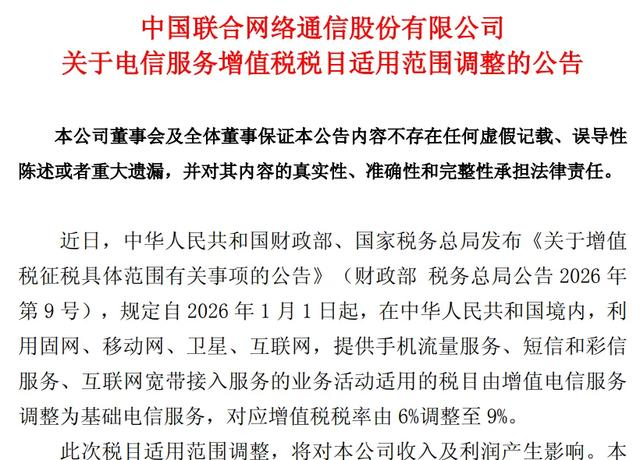中国联通发布公告称,近日,中华人民共和国财政部、国家税务总局发布《关于增值税征税具体范围有关事项的公告》(财政部 税务总局公告2026年第9号),规定自2026年1月1日起,在中华人民共和国境内,利用固网、移动网、卫星、互联网,提供手机流量服务、短信和彩信服务、互联网宽带接入服务的业务活动适用的税目由增值电信服务调整为基础电信服务,对应增值税税率由6%调整至9%。此次税目适用范围调整,将对本公司收入及利润产生影响。