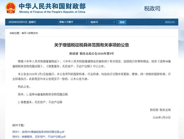 1月31日,财政部、税务总局发布《关于增值税征税具体范围有关事项的公告》,明确了适用9%和6%增值税税率范围,以及销售服务、无形资产、不动产具体范围,这涉及多档税率。该《公告》自2026年1月1日起施行。