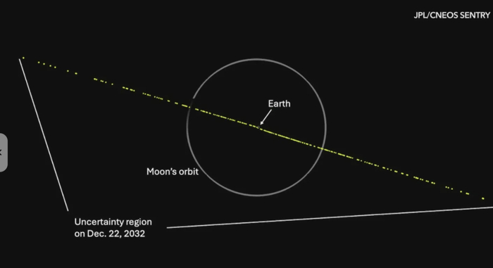 “1月27日,该概率超过了1%,这是一个重要的门槛,” JPL在一份声明中表示。“如果2024 YR4真的处于撞击轨道,其潜在撞击区域可能涵盖东太平洋、南美北部、大西洋、非洲、阿拉伯海和南亚。”