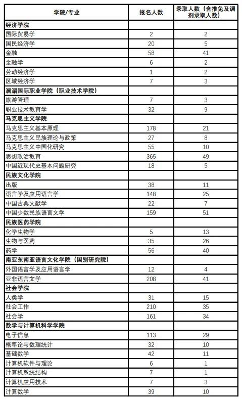 考研计划招生人数和考研报录比是考生择校择专业时的参考重点之一,因此考研报录比成为考生衡量报考难度的重要因素。为了节省考生们的时间,君君整理了“云南民族大学2024年各专业报名情况统计”。(当前官方新数据)