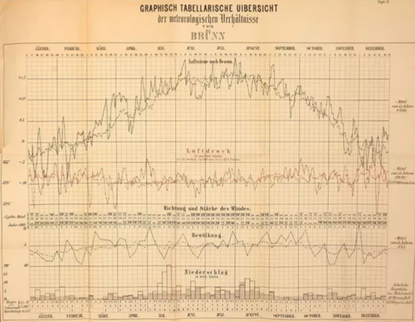 在孟德尔接管气象观测数据处理后,他用自己独特的方式(也就是用图表的方法)对这些数据进行总结和汇编,写成论文发表在1863年的学会的第一册会刊上,这就是他的第一篇气象学论文。
