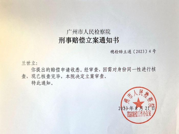在这份落款时间为2023年8月21日的通知书上,记者看到,广州市人民检察院国家赔偿工作办公室通知兰世立称,“你提出的赔偿申请收悉。经审查,因需对身份同一性进行核查,现已核查完毕,本院决定立案审查。”