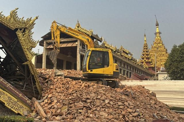 3月30日,在缅甸曼德勒,挖掘机在一处地震灾后现场参与救援活动。新华社/美联 图