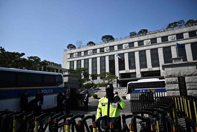 当地时间2025年4月1日,韩国首尔,警方在宪法法院前维持秩序,该法院将于4月4日对尹锡悦总统的弹劾案作出期待已久的裁决,尹锡悦因宣布戒严而被暂停职务数月。视觉中国 图