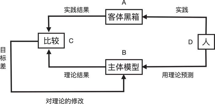 图3图中A表示客观存在,即黑箱。B表示人的主观认识,即模型。一开始,人们的主观认识不一定符合客观实际,甚至可能相差很远。人们不断地去实践,不断地把从理论中得出的预期结果(B的输出)和人们实践的结果(A的输出)加以比较。如果理论结果和实践结果有差距,那么就需要我们修改自己的主观认识,使理论结果和实践结果之间的差距缩小。这样只要我们不断实践,不断比较,不断修改主观认识,不断使理论结果和实践结果之间的差距缩小,我们就能保证自己的主观认识不断地逼近客观真理。显然,“实践—理论—实践”的循环模式反映了人们用负反馈调节原理、认识真理的过程。只要有这种调节机制存在,无论一开始的理论是多么粗糙,和实际相差多么远,它都可以通过不断修正自己而逼近真理。读者可以发现图3实际上是图1的精确表达。图3中D、B、C都是属于图1的主体部分。图3相当于把认识主体分解成为能动精神、知识系统和鉴别系统3个子部分。
