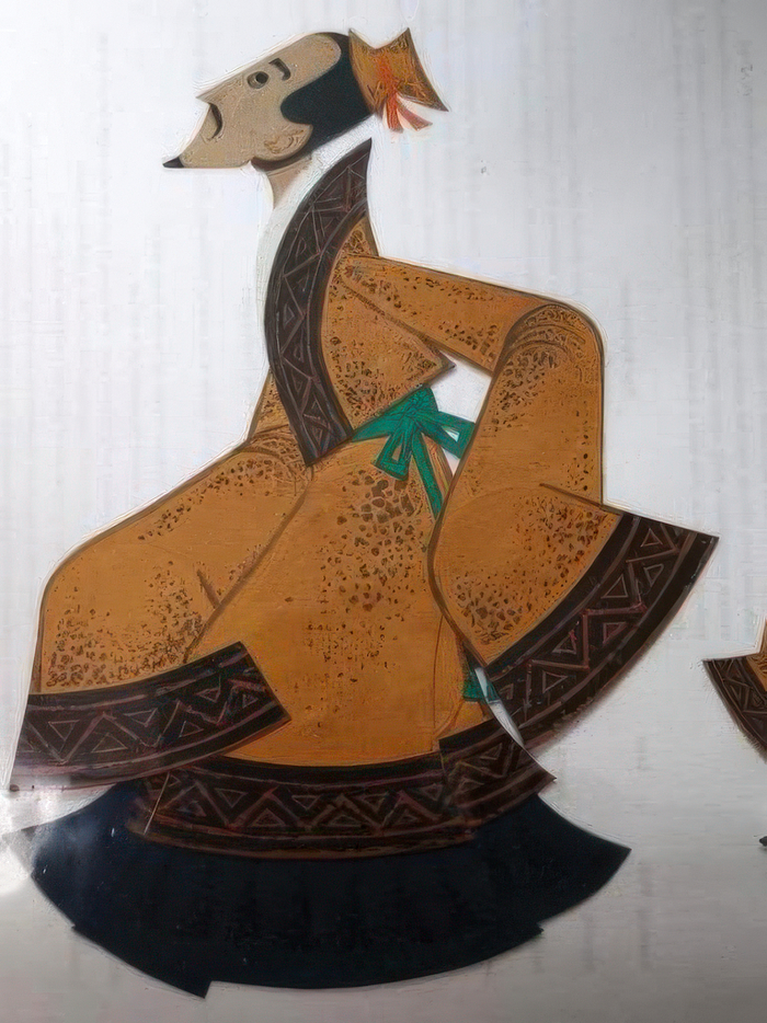 绘制的试验人物(画像砖拓片效果彩色人物)在剪纸人物的关节处理及人物动作设计环节,汉代人物衣裙长达脚背的服装特点给人物表演带来困难。动作设计师反复试验关节的最佳活动效果,与绘制人员一起研究设计出特殊的裙边关节,使人物的走路动作、个性化表演变得惟妙惟肖。