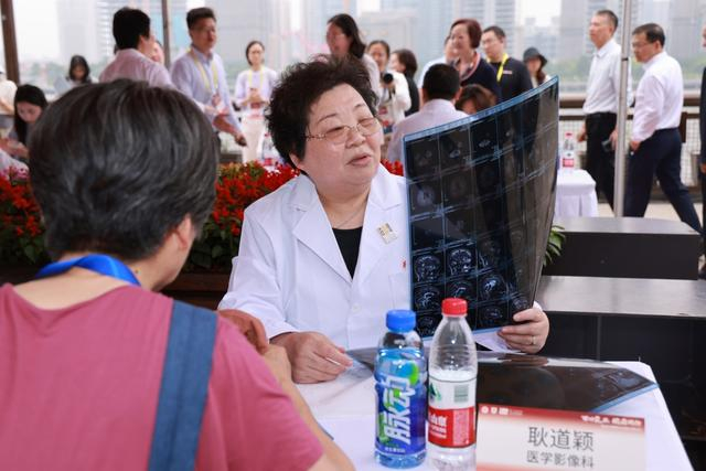 义诊现场,华山医院专家查看影像资料,为市民提供医疗咨询服务。