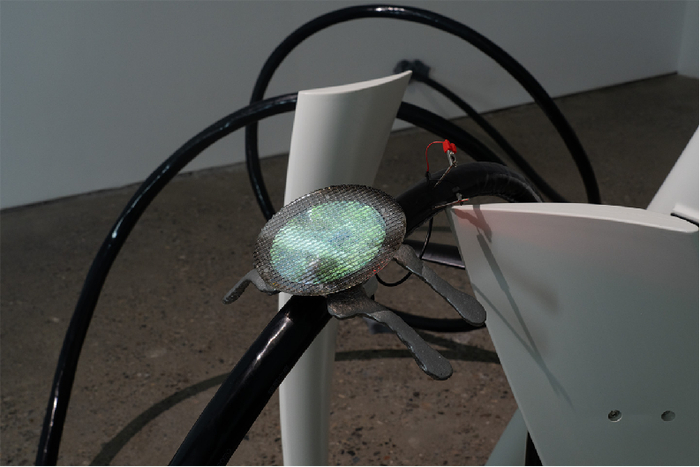 郭城《占位者No.2》,2024。图片由嘉宾郭城提供。郭城的“占位者”系列作品灵感源于其田野考察中的观察。尽管被包装为“绿色能源”,郭城注意到风力发电机(特别是叶片)会杀死鸟类、产生噪音、改变局部温度与气流,其环境影响不容忽视。墨脱是中国最后一个通公路的县城,经由318国道进入墨脱的过程让郭城深刻感受到公路作为基础设施对生态的切割作用——它将原本连续的生态环境分割成碎片化的区域,阻碍了物质交换和生物流动。在作品《占位者No.2》中,郭城使用了垂直轴风力发电机叶片,将其与高压电缆连接。电缆上安装了一个小型LCD屏幕,通过两根细小的探针从高压电缆上巧妙取电。屏幕上循环播放着森林航拍影像。这件作品直观地表达了技术基础设施(如风电场)如同“占位者”(Niche Squatter),侵入了生态系统,抢占或改变了原本属于其他生物的生态位(ecological niche)。另一件相关作品《占位者No.1》则使用了皮质手动变速杆作为核心元素,象征公路及其对自然环境的切割与干预力量,呼应了墨脱公路的观察。