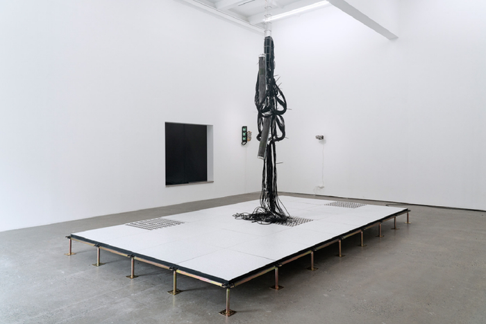 在外部明亮空间的入口处,装置《石蛹 No.2》悬吊于防静电地板之上。郭城创作了两根形似地质岩芯的柱状结构,并用网线桥架和网线进行缠绕,形成一种独特的质感。岩芯表面覆盖的绿色薄膜通过机械装置进行缓慢的升降和旋转运动,呈现出鳞翅目昆虫在蛹期内发育的状态。技术所依赖的物质基础源于漫长的地质时间,这件作品回应了人类为建造技术基础设施而从自然中大规模攫取资源的行为。