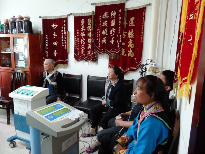 羌族诊所内设有电针仪器,图片由嘉宾赖立里提供。在羌族医生的诊所,电针仪器与传统拔罐药罐并置,采集的草药被加工成药酒或药膏,装在药柜顶上的瓶罐中。阿昌族的医生给骨折病人细心调制多种草药组方的外敷药贴:这些草药,它们成长的山川、土壤、气候、阳光、雨露,被医生从不同的地方在不同的时间采集到一起,再经过他自己的加工,汇集成这样一个药膏,用到病人的身上。这不是一个简简单单的“技术物”,更是“聚集物”(gathering)。这些医生不关心“自然是什么”,他们更关心药是否起效,或者说,自然能做什么。或许,有效性本身就是自然与技术的共同作品——阳光雨露塑造草药生长,而医生的经验让自然物质转化为治疗力量。