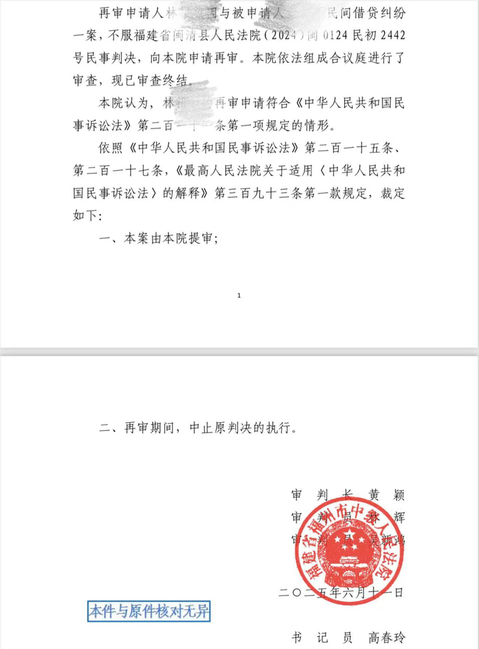 福州中院裁定提审该案6月11日,福州市中级人民法院作出民事裁定书,该再审申请符合《民事诉讼法》第二百一十一条第一项“有新的证据,足以推翻原判决、裁定”的规定,作出“本案由本院提审”“再审期间,中止原判决的执行”的裁定。