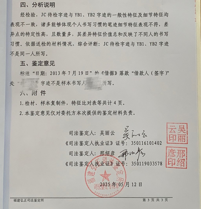 5月12日,福建弘正司法鉴定所出具两份司法鉴定意见书。其中文书鉴定的最终鉴定意见为“《借据》落款‘借款人(签字)’处‘林惇’字迹不是样本书写人林惇所写”。