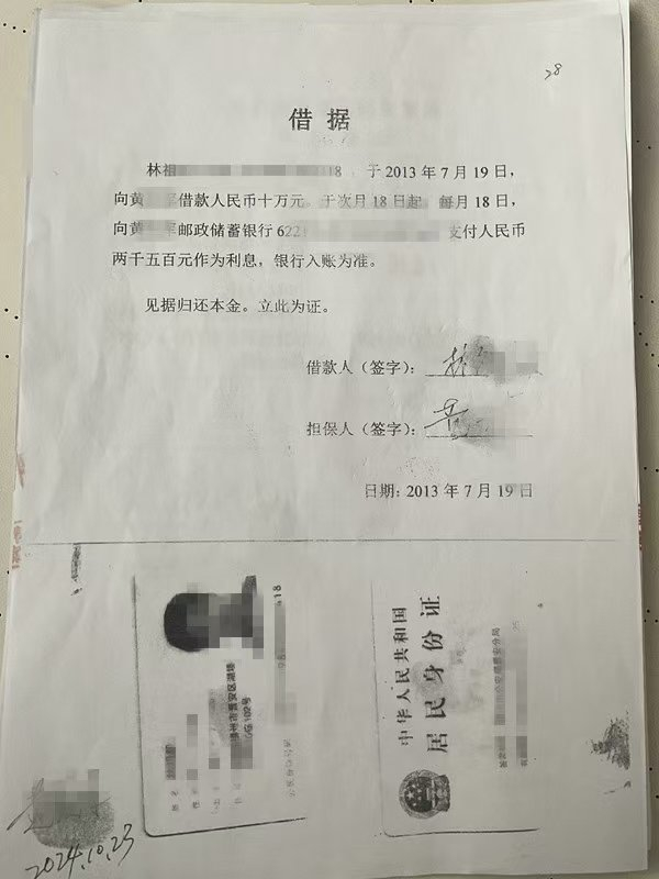 涉案判决书显示,针对债权人黄成钧提起的追偿2013年一笔10万元的借款,闽清县人民法院判决被告林惇败诉并偿还本息。黄成钧称该案借款人为林惇,担保人为林的高中同学黄晖,虽与林不相识,但对方借款时提供了身份证复印件,后因联系不上黄晖且无林联系方式,于2024年9月起诉。
