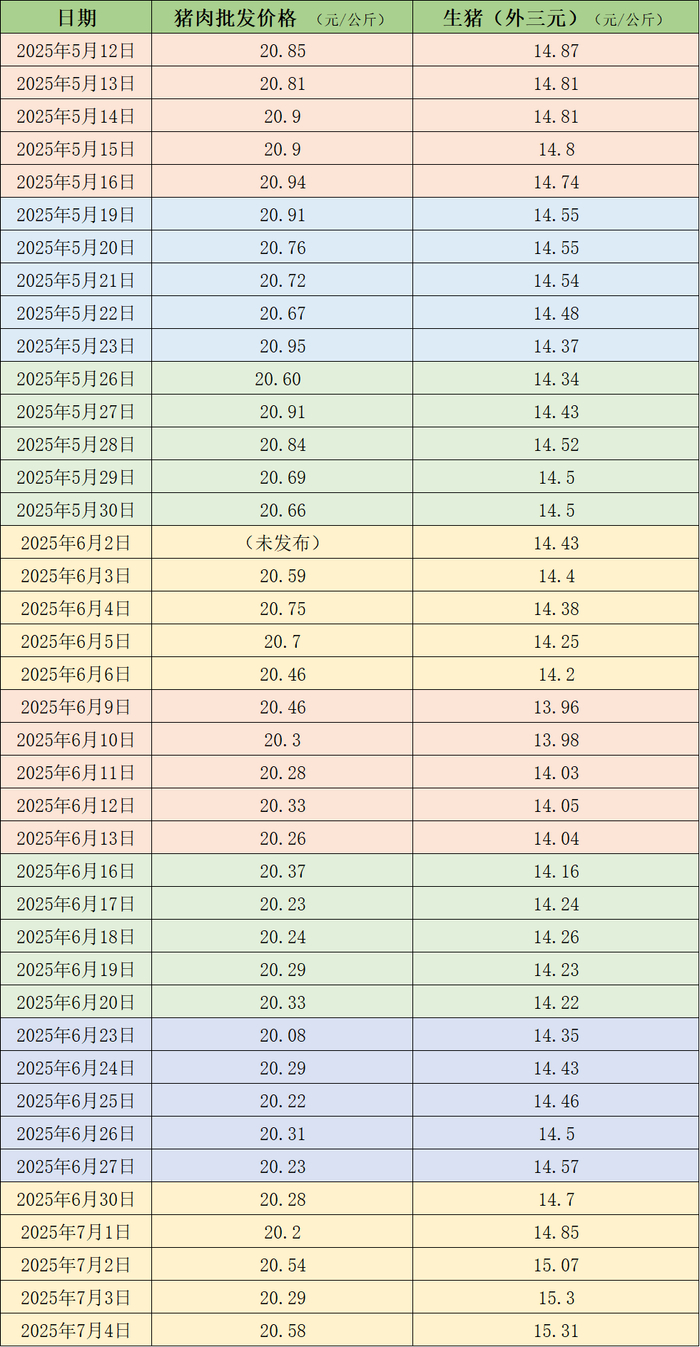 据农业农村部监测,7月4日,全国农产品批发市场猪肉平均价格为20.58元/公斤,与上周五(6月27日)的20.23元/公斤相比,上涨1.7%。本周的平均价格为20.38元/公斤,与上周20.23元/公斤的均价相比,上涨0.7%。