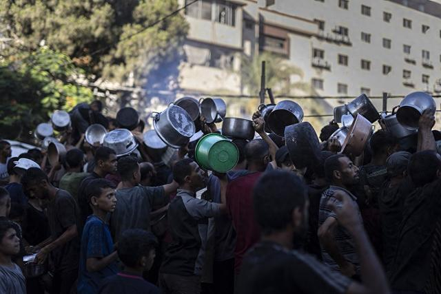 当地时间2025年7月11日,加沙城,由于以色列对加沙的持续袭击,粮食不安全状况恶化,巴勒斯坦民众聚集在里马尔社区,领取慈善组织分发的餐食。视觉中国 图