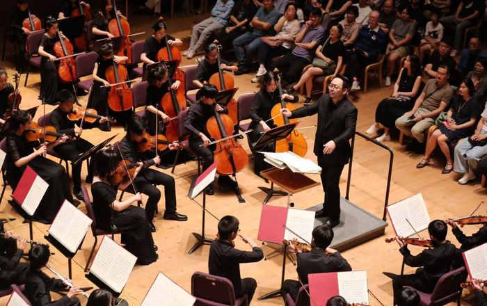 7月12日,在指挥家张橹的执棒下,73名团员献上"十周年专场音乐会",在中西合璧的曲目中发出响亮的青春之声。