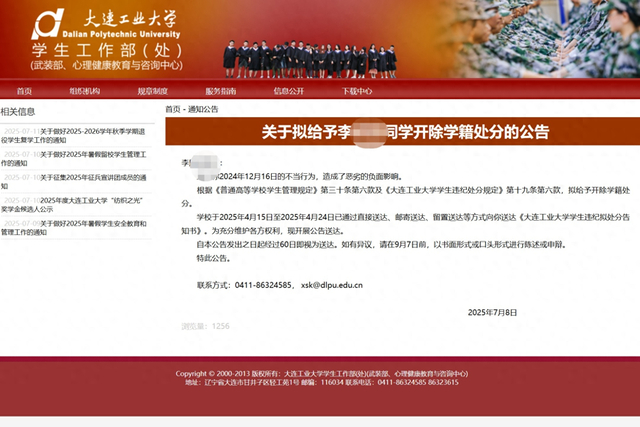 大连工业大学学生工作部官网近日发布的一份《关于拟给予李某某同学开除学籍处分的公告》引发舆论场高度关注。