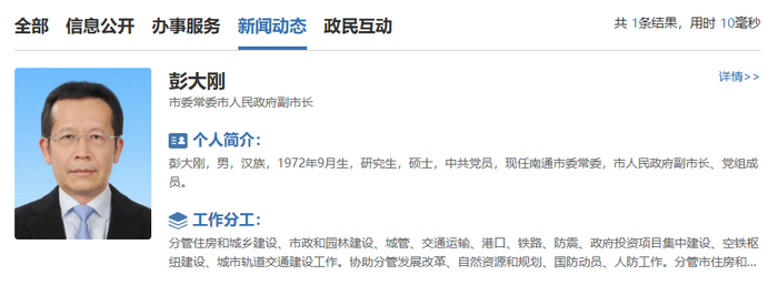 近日,南通市政府官网显示,彭大刚已任南通市委常委、副市长。