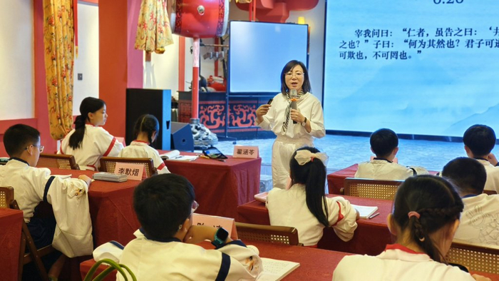 论语启蒙进阶课上,孩子们身着汉服沉浸式学习《论语》。