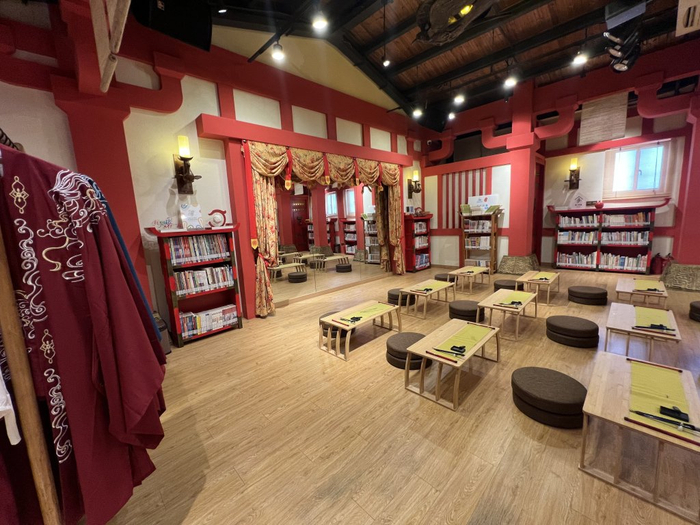 而相邻的东殿,则藏着另一片阅读天地:靠墙的三层红色矮书架摆满传统文化书籍与绘本,小朋友们可以坐在矮桌前席地阅读。整面玻璃让空间更加通透,搬走桌椅后,这里又变身舞蹈房,供社区舞蹈队排练使用。汉服衣架上挂满的各式传统服饰,随时为沉浸式体验活动待命。