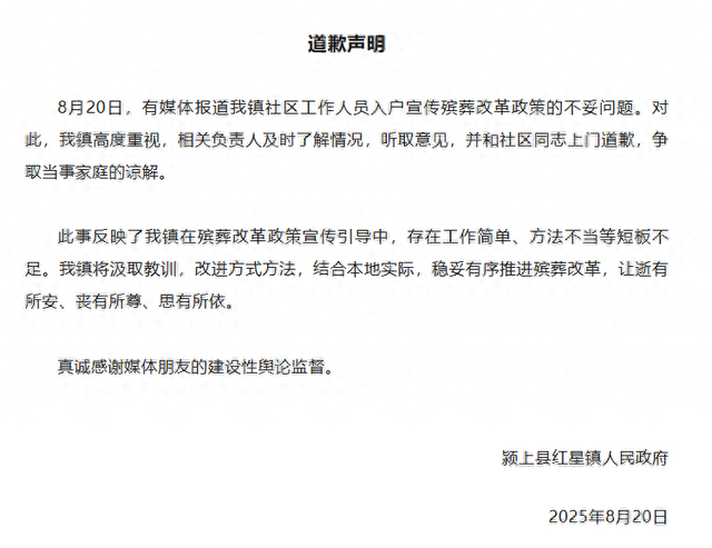 8月20日晚, 安徽阜阳 颍上县红 星镇人民政府发布道歉声明: