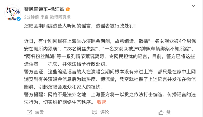 警方查证,这些编造谣言的人在演唱会期间根本没有来过上海,都只是在家中上网浏览到有关演唱会信息后为蹭热度、博流量,凭空就杜撰了上述谣言并发布在微信圈群,引起演唱会观众和家人的担忧。