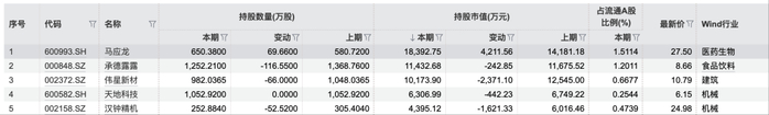 具体来看,香港金融管理局持仓马应龙650.38万股,持仓市值为1.84亿元,位居第一,二季度小幅增持69.66万股;持仓承德露露1252.21万股,虽减持116.55万股,但持仓市值仍有1.14亿元;伟星新材被减持66万股,期末持有982.04万股,持仓市值1.02亿元;天地科技持仓不变,仍为1052.92万股;仅持有汉钟精机(002158)252.88万股,较上季度末减持52.52万股。