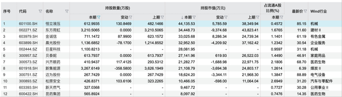 恒立液压是其持仓市值最重的股票,本期持有612.99万股,加仓130.85万股,持仓市值4.41亿元。东方雨虹(002271)、金诚信(603979)、晨光股份(603899)的期末持仓市值也超过3亿元。