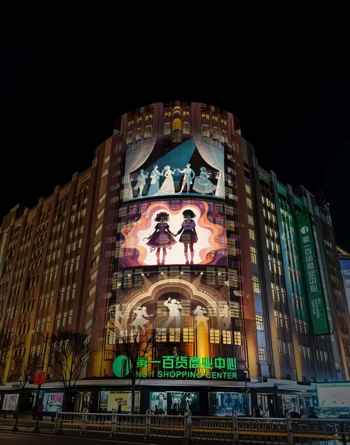 南京东路第一百货投影秀效果图。上海市黄浦区供图一是聚焦南京东路、洛克·外滩源等重点区域,联动六合路创意市集等多元活动,融合光影艺术装置、沉浸式投影、主题夜游等内容,塑造南京路和外滩源的消费新名片,进一步提升商圈影响力与吸引力。