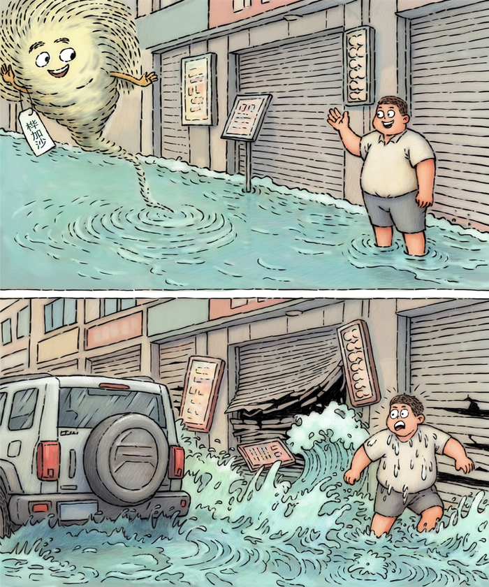 李某某年纪也不小了,台风天驾车“玩水”看似个人玩乐,却给周边商家带来了实实在在的财产损失,理应受到法律惩处。被行拘10日,一点不冤。(图/蒋立冬 文/阳柳)