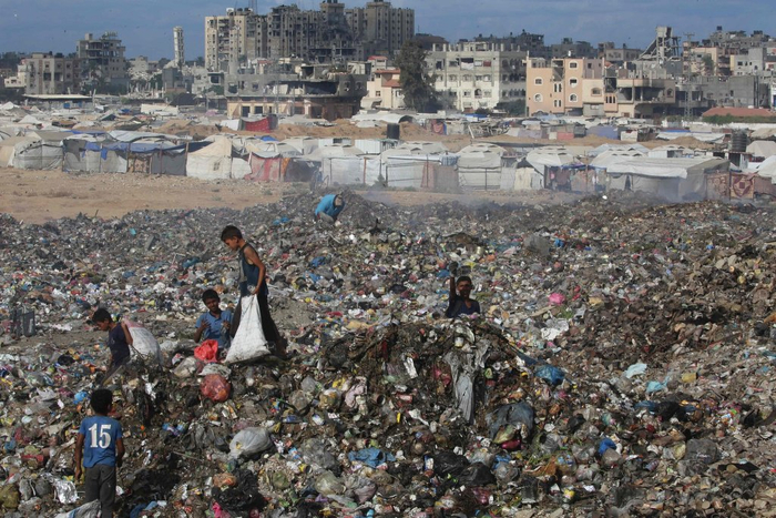 当地时间2025年10月6日,加沙地带中部布雷吉难民营,流离失所的巴勒斯坦儿童在一堆垃圾中寻找可用作燃料的物品。视觉中国 图