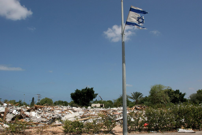 2005年9月8日,加沙地带,原内夫德卡利姆定居点被拆毁的犹太定居者房屋废墟上,一面破损的以色列国旗在飘扬。视觉中国 图虽然撤离,但以色列仍然掌控加沙地带的所有对外通道,陆路口岸、海岸线及领空。2007年,巴勒斯坦伊斯兰抵抗运动(哈马斯)夺得加沙地带控制权,以色列由此对加沙地带物资和人员出入实施全面限制。十多年间,加沙地带的巴勒斯坦武装组织多次与以色列发生冲突。