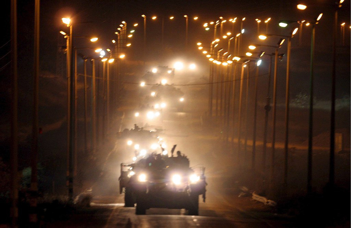 当地时间2005年9月12日,加沙地带,以色列装甲车队从加沙地带撤离,驶向基苏菲姆过境点。视觉中国 图