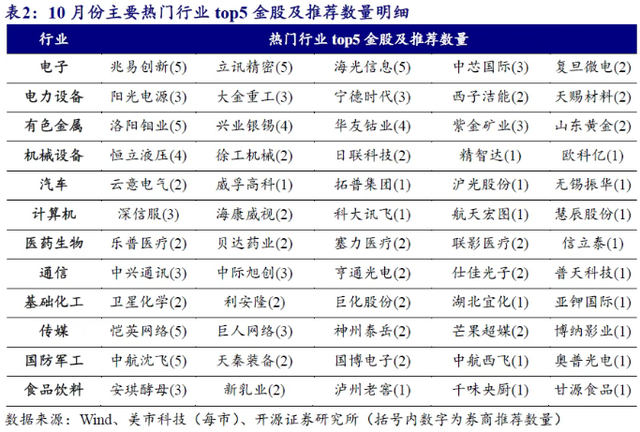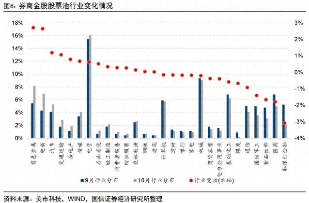 行业方面,国信证券研报指出,在对券商金股股票池进行去重后,从绝对占比来看,券商10月金股在电子、机械、有色金属、电力设备及新能源、基础化工等行业配置较高。