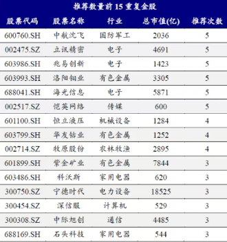 个股层面,开源证券数据显示,10月各家券商推荐的金股中,中航沈飞(600760)、立讯精密(002475)、兆易创新(603986)、洛阳钼业(603993)、海光信息(688041)、恺英网络(002517)等6只股票,被推荐次数最靠前,合计均被推荐了5次。