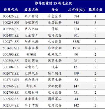 安琪酵母(600298)、巨人网络(002558)、大金重工(002487)、阳光电源(300274)等,合计均被推荐了3次。