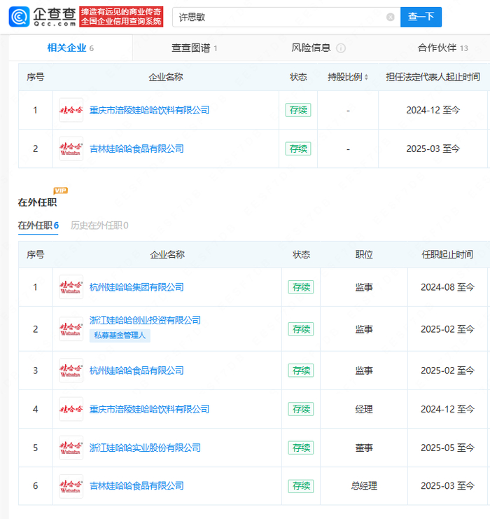 值得注意的是,除杭州娃哈哈集团公司和重庆涪陵娃哈哈饮料公司外,许思敏在其他4家公司的任期均从2025年开始。