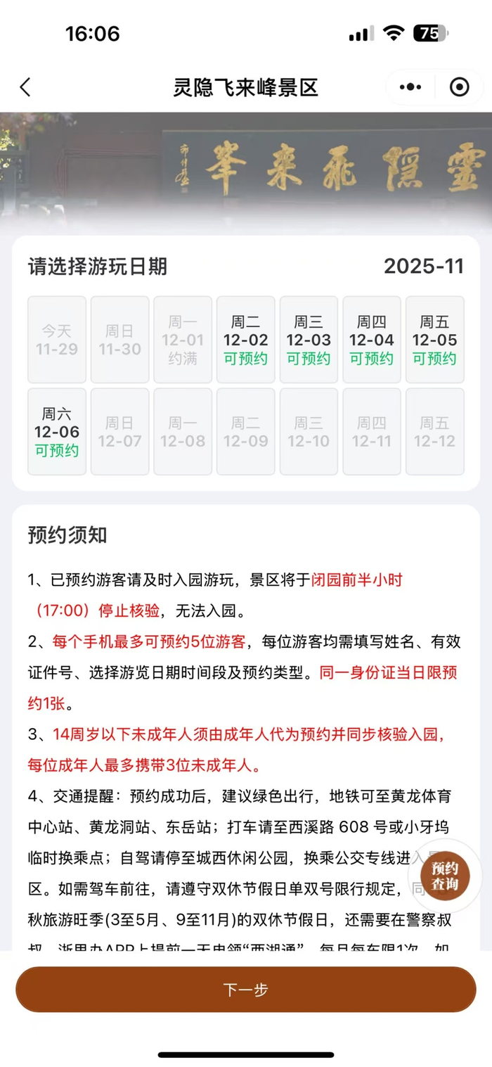 免票后,景区实施“实名预约、分时游览”的管理方案。游客(含旅行社团队)至少提前1天预约未来7日的入园名额;设定工作日3.5万人次、双休日5万人次、节假日6.5万人次的每日预约上限,按上午(7:30-12:00)、下午(12:00-17:00)两个时段分段预约,引导错峰出游。24日8时,支付宝、微信的“杭州灵隐飞来峰”官方小程序开放入园预约,一部手机最多预约5人,70周岁(含)以上的老年人等免预约入园。澎湃新闻记者29日下午登录发现,两个渠道均显示12月1日(下周一)已约满。
