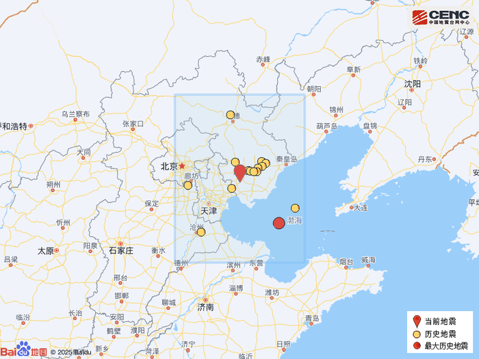历史地震:根据中国地震台网速报目录,震中周边200公里内近5年来发生3级以上地震共15次,最大地震是2025年7月27日在渤海海域发生的4.4级地震(距离本次震中163公里),历史地震分布如图。