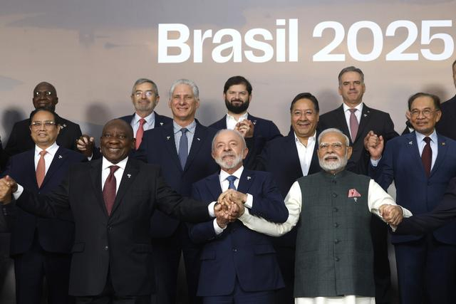 当地时间2025年7月7日,巴西里约热内卢,(前排左起)金砖国家领导人峰会期间,南非总统西里尔·拉马福萨、巴西总统卢拉和印度总理莫迪出席合影。本次会晤主题是“加强全球南方合作,促进更加包容和可持续的治理”。会议宣言强调坚持通过对话协商和外交途径以和平方式解决国家间的分歧和争端。视觉中国 图