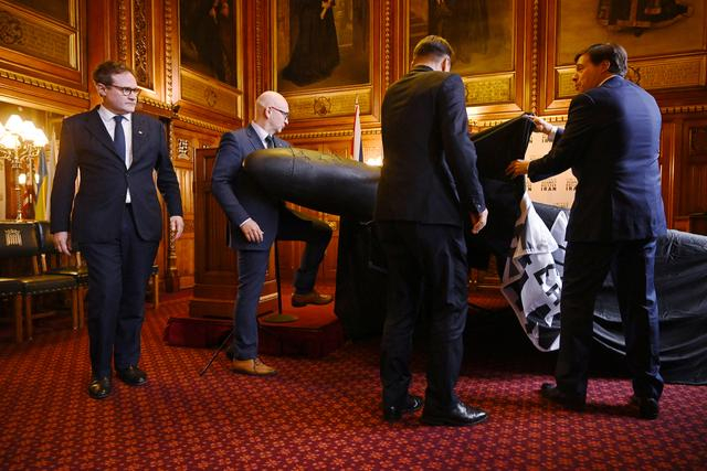 当地时间2025年10月14日,英国伦敦,汤布里奇议员汤姆·图根达特(左)在议会大厦观看一架被击落的伊朗制造的“见证者-136”攻击型无人机。该无人机被俄罗斯用于俄乌冲突中。视觉中国 图